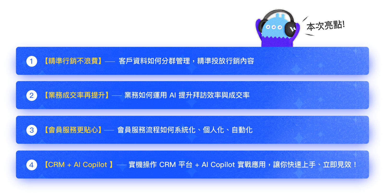 適合行銷、業務、客服與會員管理人員參加,無需技術背景也能快速上手、立即見效!