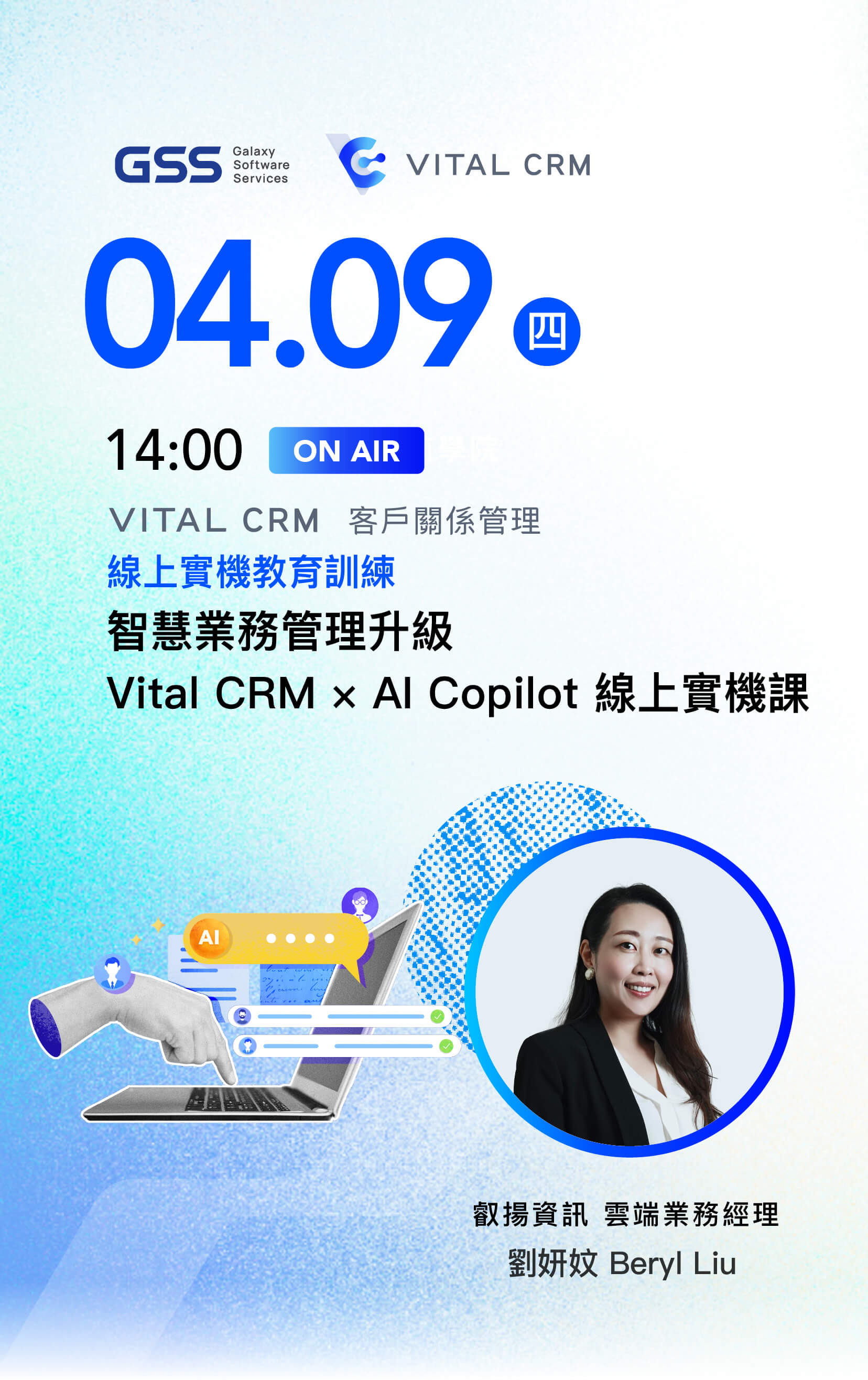 活動日期|2026 / 04 / 09 (四) 14:00 – 16:00 活動地點|本場次活動使用 Microsoft Teams 平台 (將於 13:50 開放加入會議) 主辦單位|GSS 叡揚資訊股份有限公司 洽詢專線|(02)2586-7890 分機 10767 王小姐 或 Email: vitalcrm@gss.com.tw |