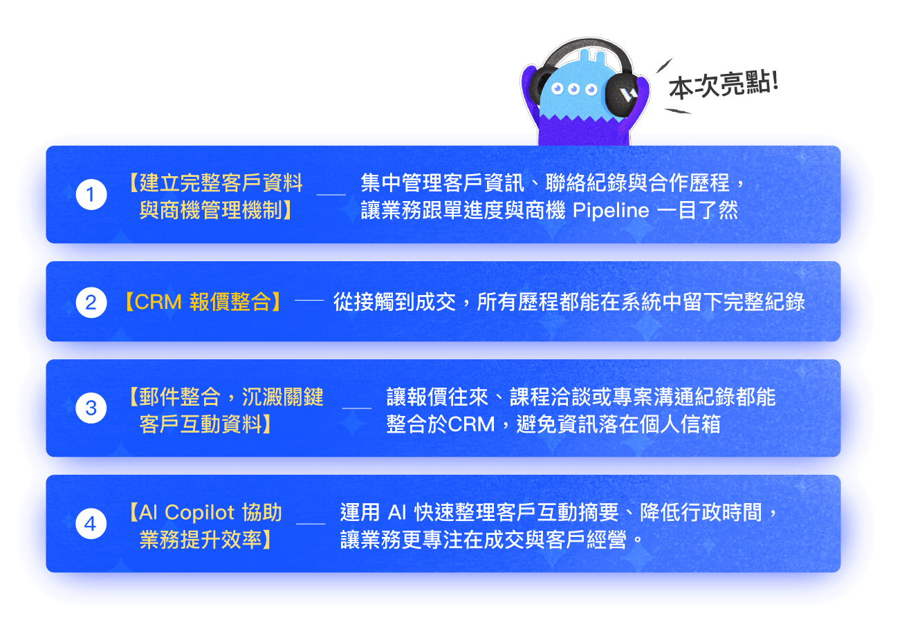 - 業務跟單、報價與回覆紀錄落在個人信箱,主管難以掌握 Pipeline 與成交進度