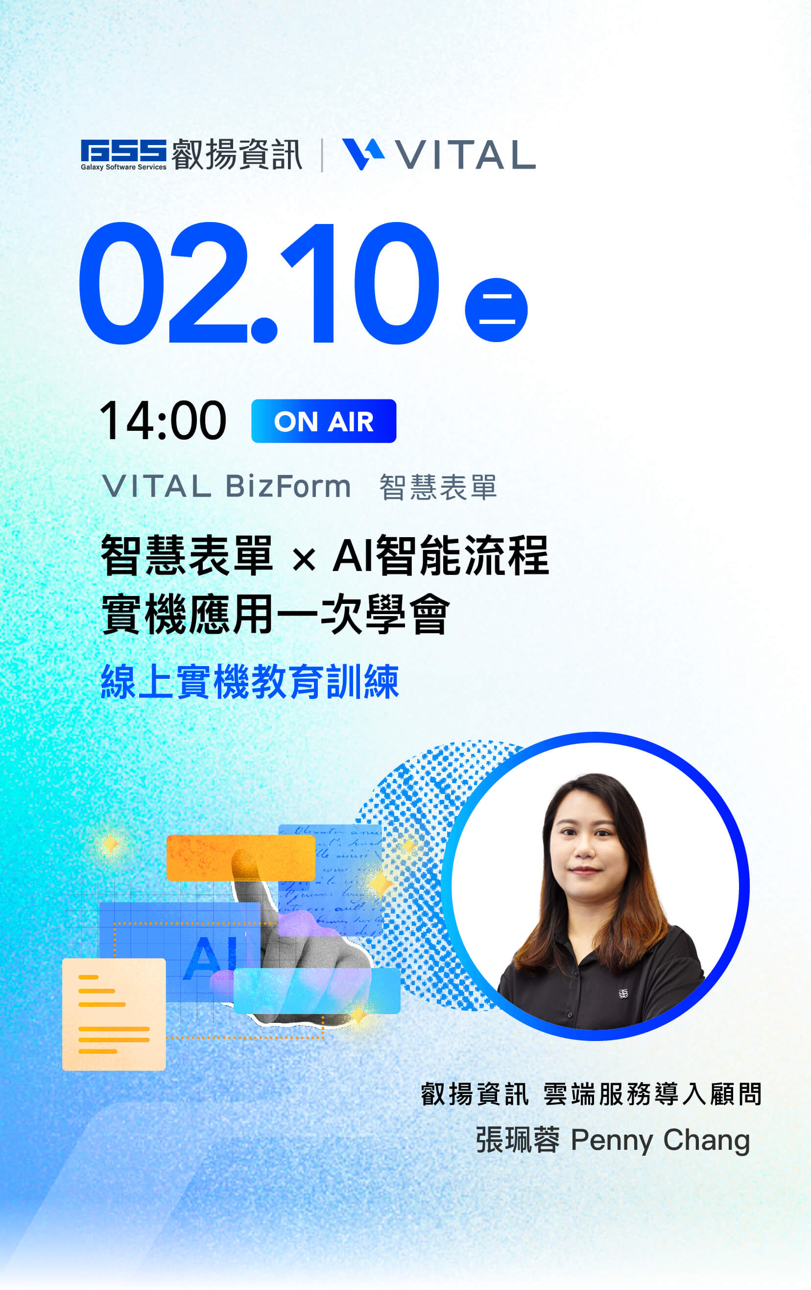 活動日期| 2026 / 2 / 10 (二) 14:00 - 15:30 活動地點| 本場次活動使用 Microsoft Teams 平台 (將於 13:50 開放加入會議) 主辦單位| GSS 叡揚資訊股份有限公司 洽詢專線| (02)2586-7890 分機 10859 Camila 或 Email: vitalcrm@gss.com.tw |